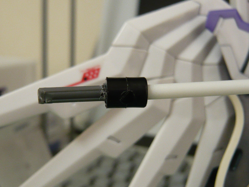 通常形態時に震激槍・改を腰後部にマウントする(上写真の腰側面に装備してるパーツは、本来腰後部で槍をマウントしているパーツ)関係上、槍の柄自体を瞬着で太らせるってのができなかったので、ジョイントをどうするかでかなり四苦八苦したのは秘密。
