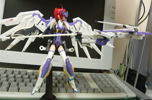 この状態でも神姫のスペックなら一応保持は可能、プラ棒も意外に強度があるのか持ちこたえてくれますが、流石に自重でちょっとヘタる上、ポーズが制限されるので、あまり自由度は高くありませんが、それでもいい。考えるな、感じるんだ(ぉ