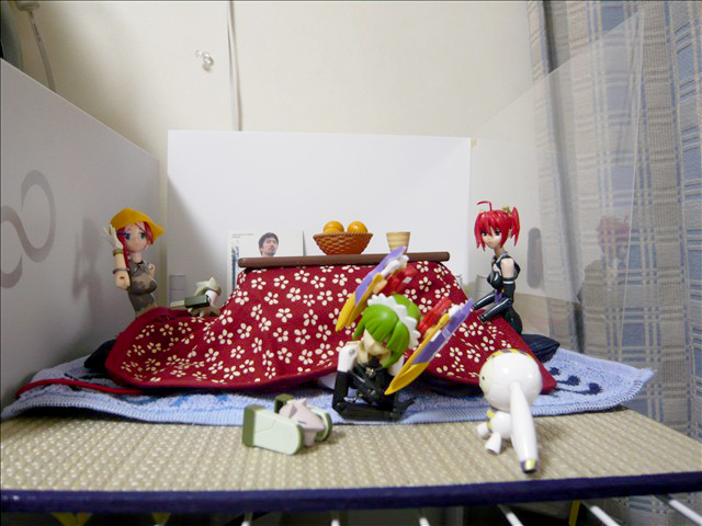 ダイソーのジョイントラックに、畳を敷いて、プラ板で壁を作り、ハンカチをカーペットにして、コタツを置いて完成。